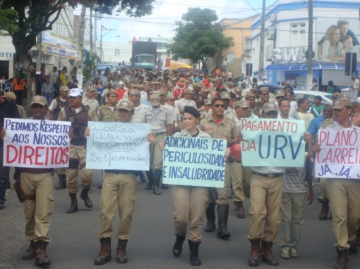 Cerca de 400 policiais e bombeiros militares participaram na manhã de sexta-feira (3), de uma caminhada a partir da Rua Dois de Julho, percorrendo as principais ruas do centro da cidade. A manifestação foi acompanhada por um carro de som entoando o hino da PM baiana, enquanto à frente do grupo manifestantes exibiam cartazes, com algumas de suas reivindicações: criação de um plano de carreira, pagamento da URV, melhores condições de trabalho, respeito aos seus direitos, pagamento de adicionais de periculosidade e insalubridade, etc. Alguns policiais participaram do cortejo montado em motocicletas de suas propriedades. Durante o percurso um policial do alto do carro de som anunciava que a greve não é contra a sociedade, “é um protesto contra o governo pelo não atendimento às nossas reivindicações”, explicavam. A partir da sexta-feira (3), a concentração dos policiais não será mais o prédio da Câmara Municipal.